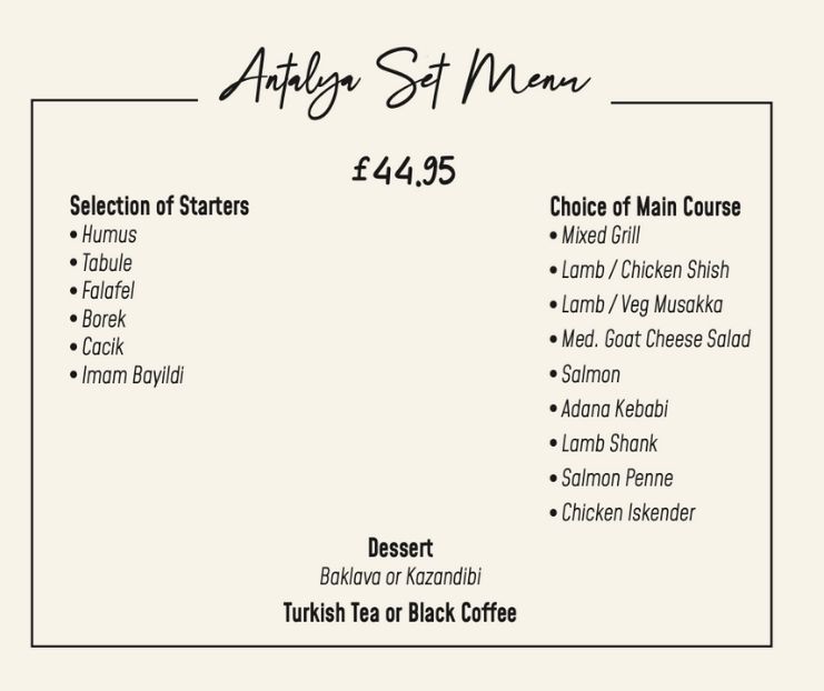 We look forward to welcoming you to Antalya Restaurant. Your health and safety is important to us.