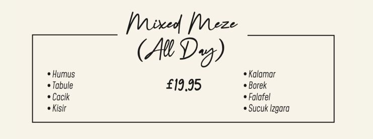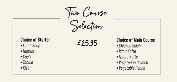 We have a wide-ranging and delectable menu. Dishes are authentic with a modern touch and stunning presentation. We pride ourselves on using only fresh and seasonal ingredients. There are selected set menu options, as well as an A La Carte menu, where you can either share or opt for individual dishes from our wide selection of mezes, grilled meats, fish and salads.- À La Carte Menu